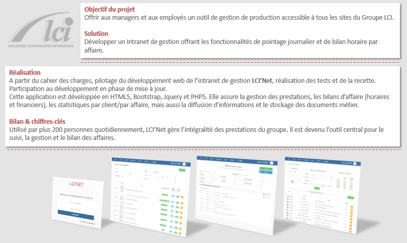 En relation directe avec les clients et les utilisateurs, j'ai su obtenir leur confiance et maintenir leur fidélité. La qualité des prestations livrées, le niveau de service offert (conseils, propositions...) et une communication régulière avec les acteurs du projet sont pour moi des éléments clés du succès d'une prestation.
